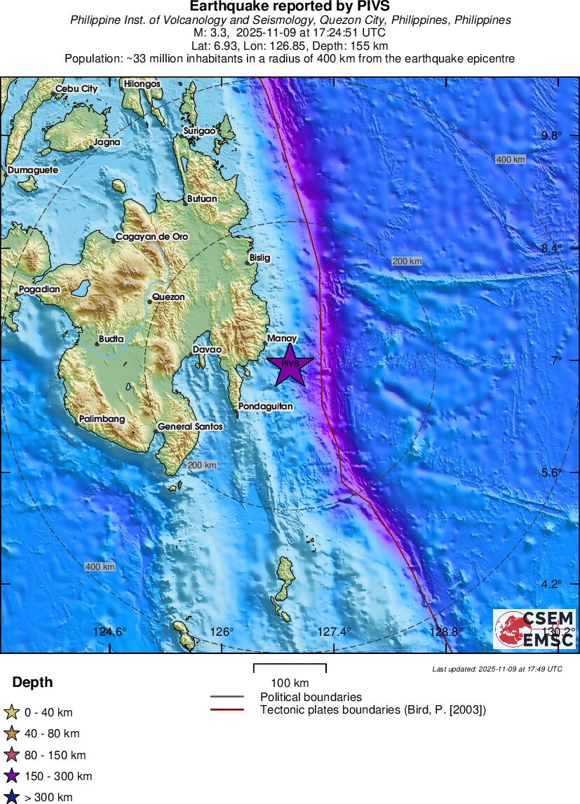 | 3.3 | 155 | 7723 | 10:24 | Link | Minor Earthquake- MINDANAO, PHILIPPINES - Today |