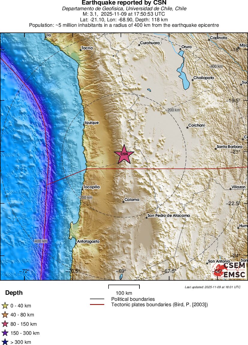 | 3.1 | 118 | 5009 | 10:50 | Link | Minor Earthquake- TARAPACA, CHILE - Today |
