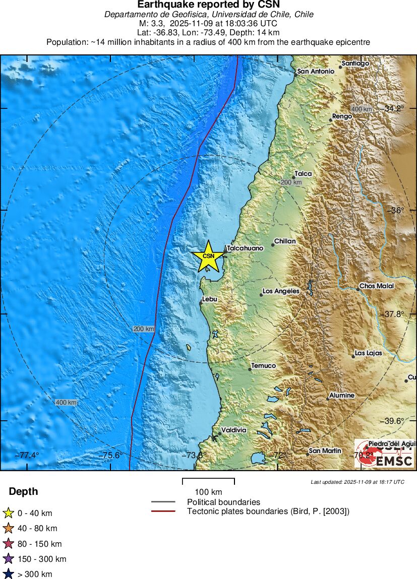 | 3.3 | 14.1 | 5901 | 11:03 | Link | Minor Earthquake- OFFSHORE BIO-BIO, CHILE - Today |